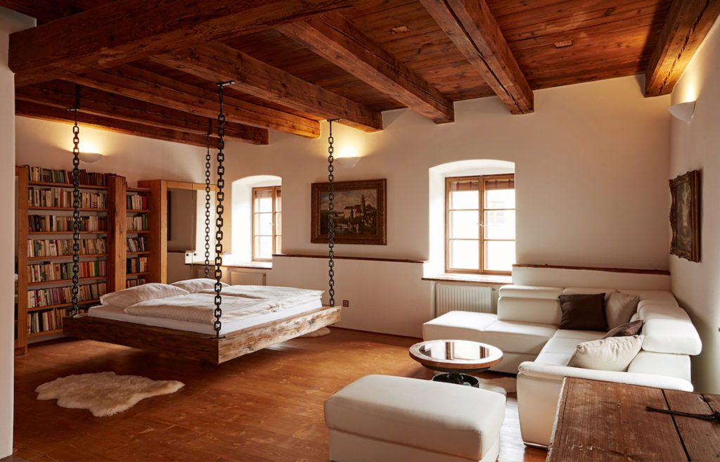 Výhled z oken na řeku Vltavu, mlýnský náhon a na českokrumlovský zámek, historické prostory s autentickým geniem loci v citlivé kombinaci s moderním designem… Je jisté, že ubytování v Krumlovském mlýně ještě umocní vaše zážitky z návštěvy Českého Krumlova. Každý z prostorných apartmánů má osobitou atmosféru, oba jsou zařízeny s důrazem na kvalitní, estetické zpracování a na maximální komfort hostů. Menšímu (60 m2) i rozlehlejšímu (70 m2) apartmánu dominují originální zavěšená letiště s velkými knihovnami plnými české i zahraniční klasiky. Ručně vyrobené doplňky z masivního dřeva doplňuje autorská keramika určená k servírování jídla. Samozřejmostí jsou plně vybavené kuchyňské linky s lednicí, myčkou nádobí, sklokeramickou deskou a dalšími potřebnými elektrospotřebiči. Součástí apartmánu č. 1 je prosklená koupelna s velkou vanou a samostatnou luxusní sprchou, toalety s bidetovou sprškou jsou umístěny u obou apartmánů odděleně. Vítaným bonusem je skvěle zásobený minibar a výběr z výtečných vín přímo na pokojích.