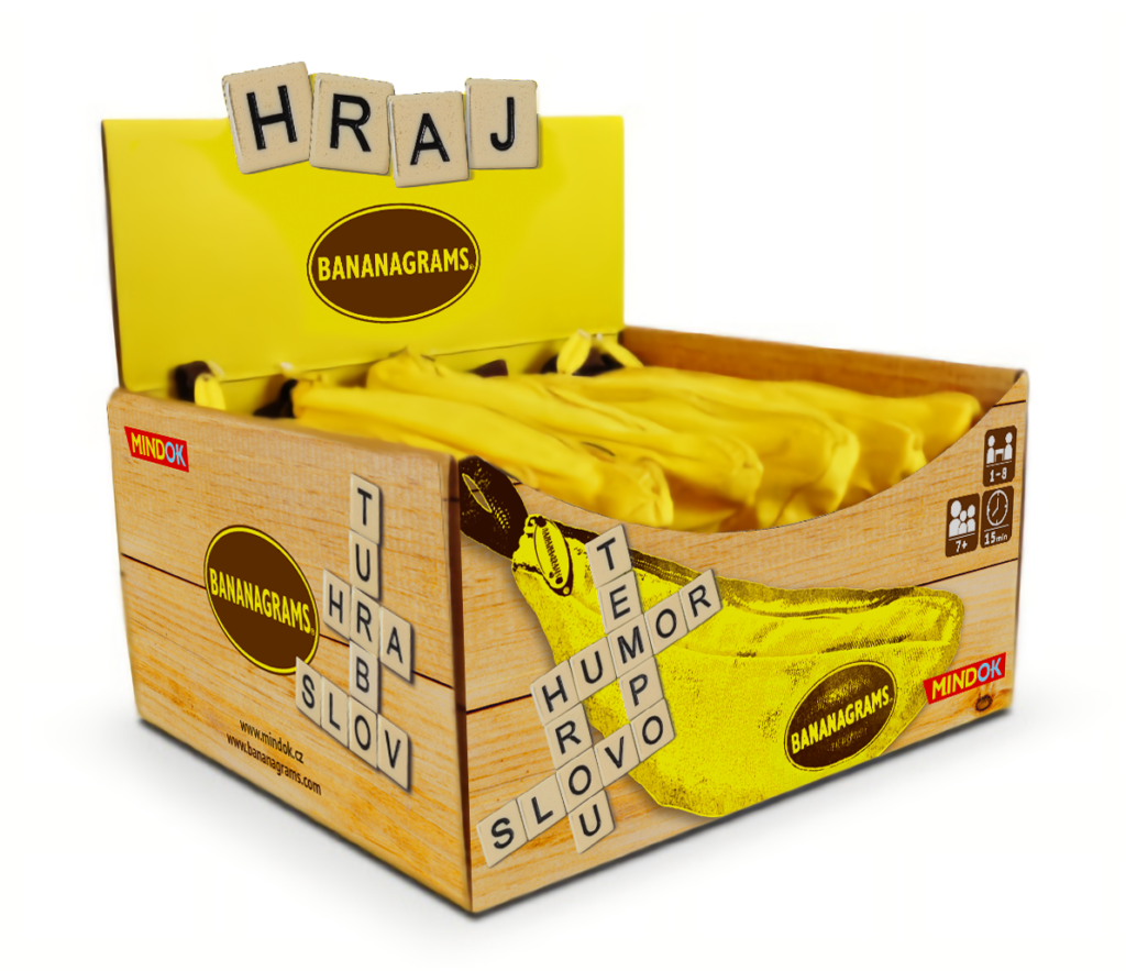 Když se řekne Bananagrams, znamená to jednoduše dynamickou hru, která se v podstatě nikdy neopakuje a vždy spolehlivě pobaví. Díky těmto atributům se Bananagrams stala celosvětovým bestsellerem. Banán s písmenky, který vypadá jako žlutý penál, je tak skladný a jednoduchý, že se vejde do jakéhokoliv zavazadla a vždy spolehlivě vyplní dlouhou chvíli při čekání na letišti, v restauraci nebo v deštivém počasí na táboře.