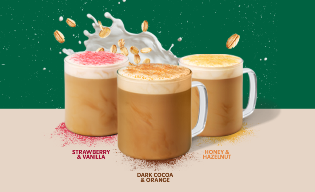 Honey & Hazelnut Oat Latte představuje nebeské spojení květové sladkosti medu a zemité chuti lískových oříšků, nechybí nadýchaná pěna a zlatý medový posyp. Trojici doplňuje Dark Cocoa & Orange Latte, rafinované prolnutí bohatých tónů tmavé čokolády a pikantního pomeranče, ozdobené lahodnou pěnou a čokoládovo-pomerančovým toppingem.