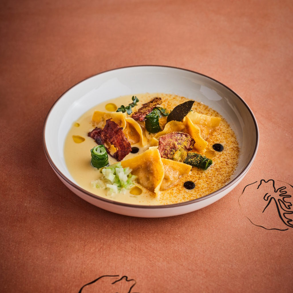 Druhý chod: Šafránové ravioli | pečená dýně | pancetta | šalvějový beurre blanc | pack choi.