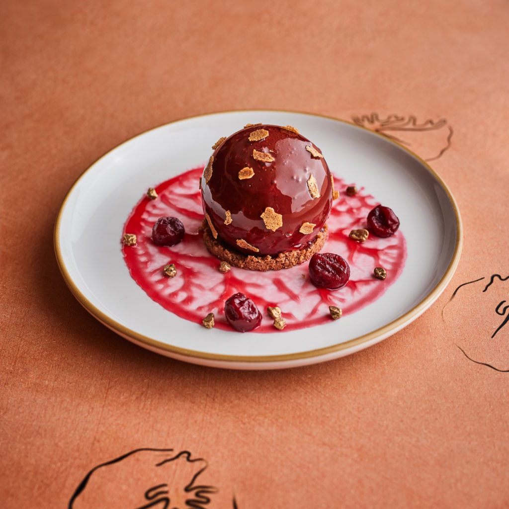 Čtvrtý chod: Višňová koule | pěna z hořké čokolády | višňové coulis.