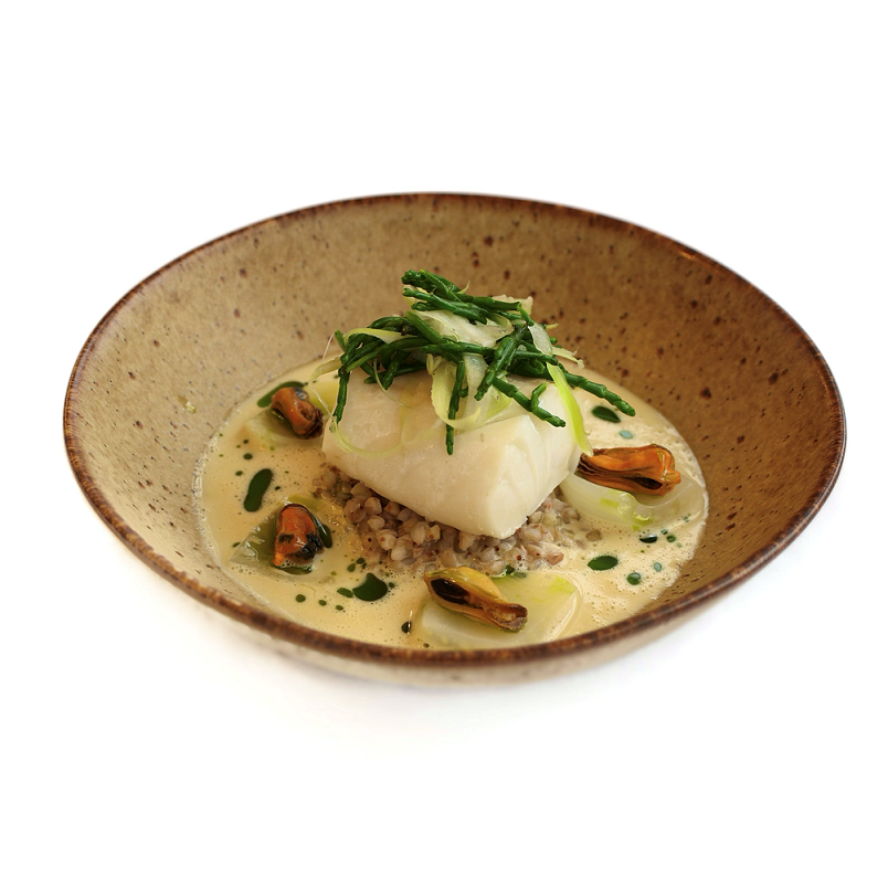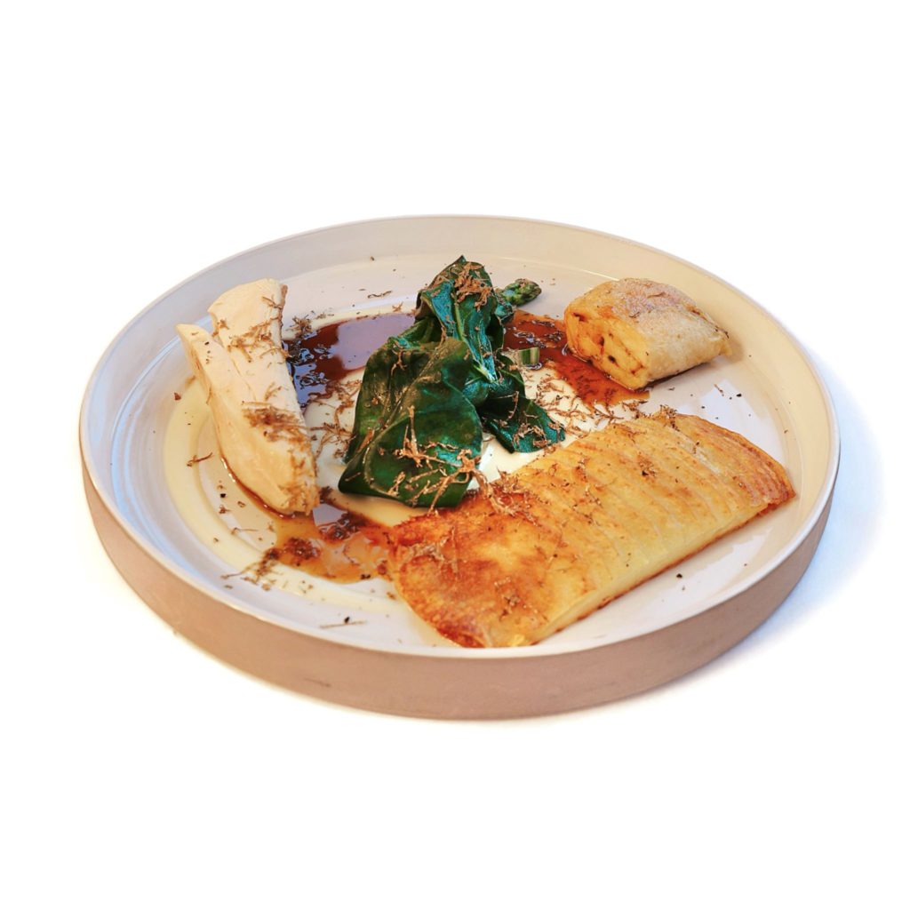 Nechybí ani sladká tečka v podobě např. pekanového semifredda s teplou čokoládou, kávou a limetou, „custard tartu“ s vanilkou, muškátovým oříškem a malinami, který vychází z receptu na tradiční cr?me br?lée nebo pečených blum s heřmánkem, medem a podmáslím.