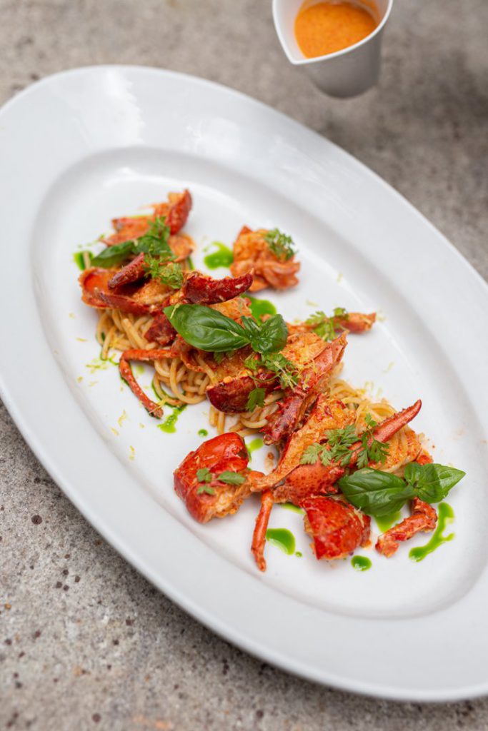 Z hlavních chodů můžete vybírat linguine se silným humřím bisquem, kandovaným zázvorem a rajčatovým tatarákem, pak ravioly plněné humřím masem, restovanými fava fazolemi, sušeným žloutkem a černými lanýži nebo gratinovanou půlkou humra s bešamelem, lanýžovým olejem, topinamburovým pyré, kaviárem a salátem z čekanky a pomeranče.