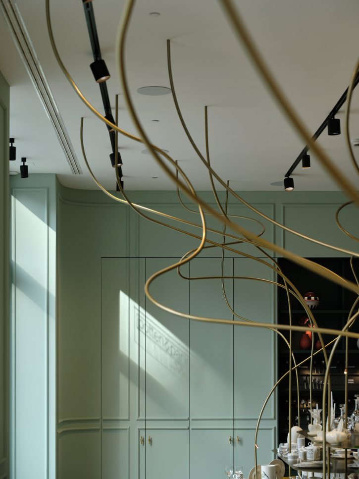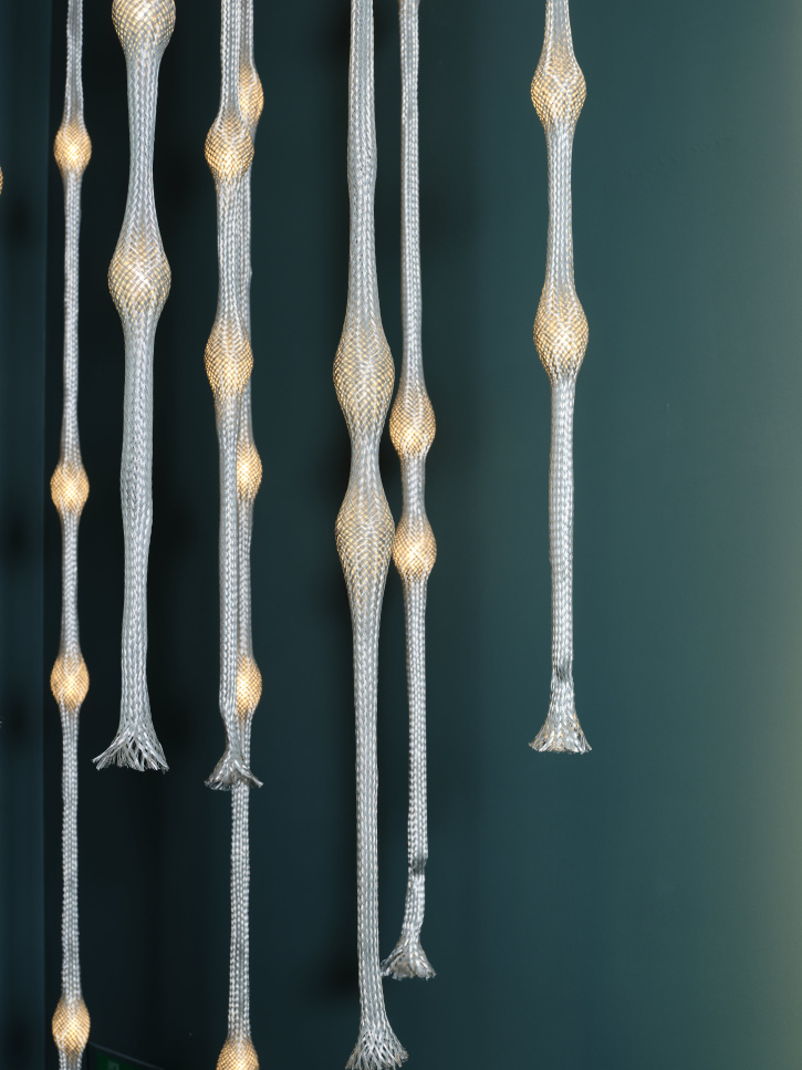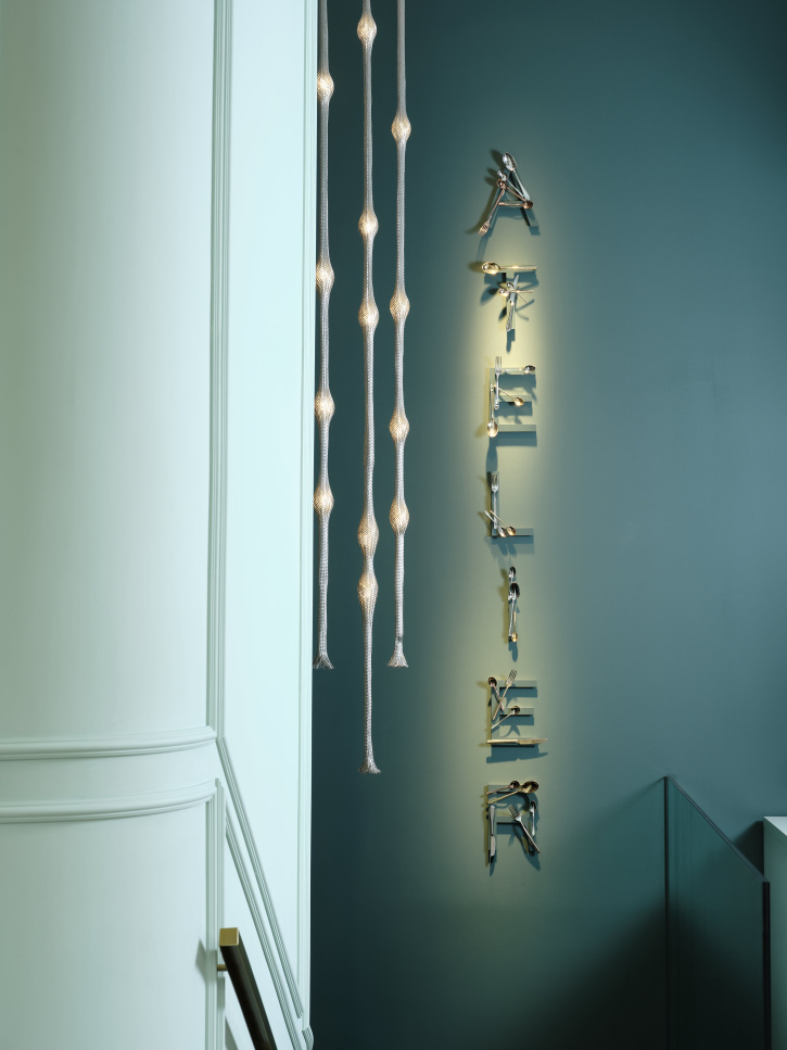 „Při scházení do patra zaujme také netradiční schodišťový lustr Liana vyrobený designovou společností Lasvit z laboratorního skla a kovového opletu, který navrhl Maxim Velčovský. Cena za tento originální designérský skvost se pohybuje v hodnotě dvou milionů korun.“